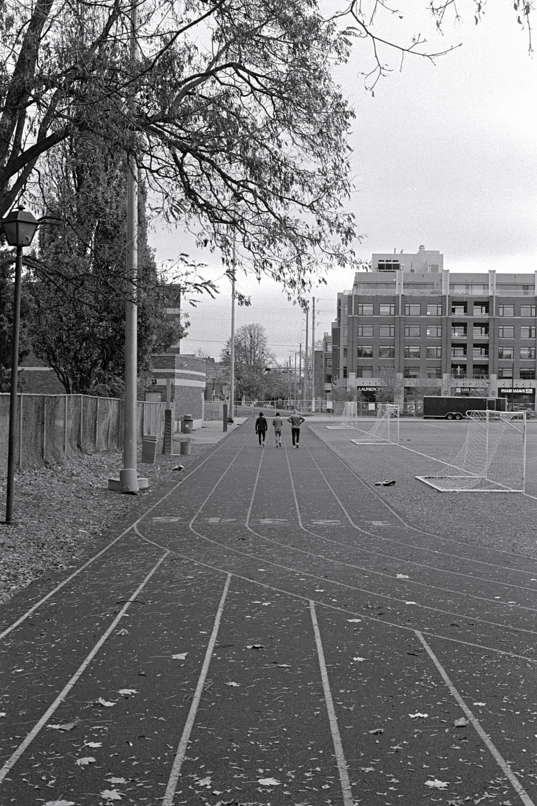 Three runners on the track outside of Immaculata High School on a crisp Saturday morning.